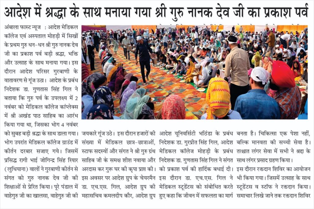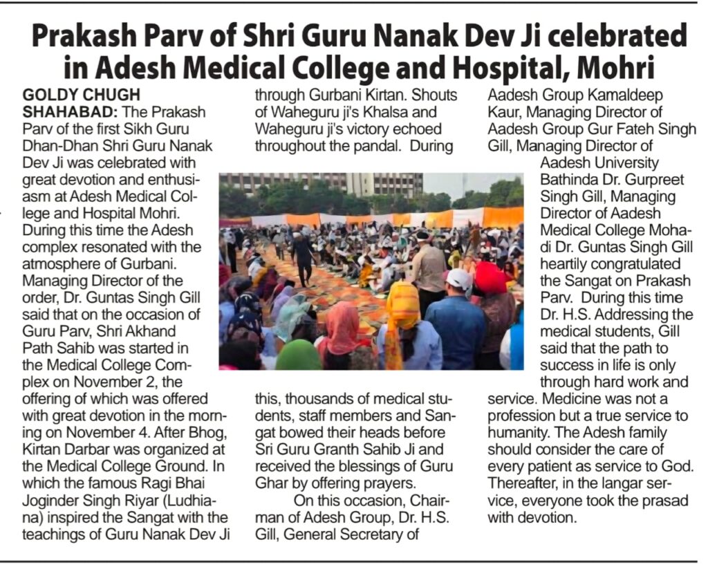 Prakash Parv of Shri Guru Nanak Dev Ji celebrated in Adesh Medical College and Hospital, Mohri administrator November 5, 2025 0 Comments You Might Also Like आदेश मेडिकल कॉलेज के पी.जी. डॉक्टर्स ने रोहतक में रचा इतिहास September 10, 2025 आदेश मेडिकल कॉलेज की उपलब्धि :एमबीबीएस सीटें 150 से बढ़कर हुई 200 September 12, 2025 आदेश में की गई अत्याधुनिक वर्टिगो लैब की स्थापना September 30, 2025 Leave a Reply Cancel replyLogin with your Social ID Save my name, email, and website in this browser for the next time I comment. Δ