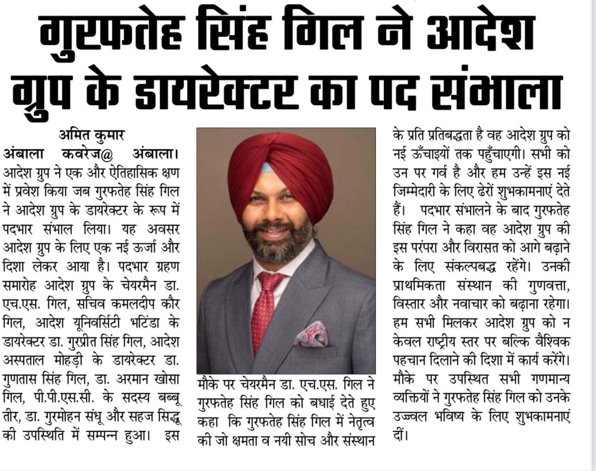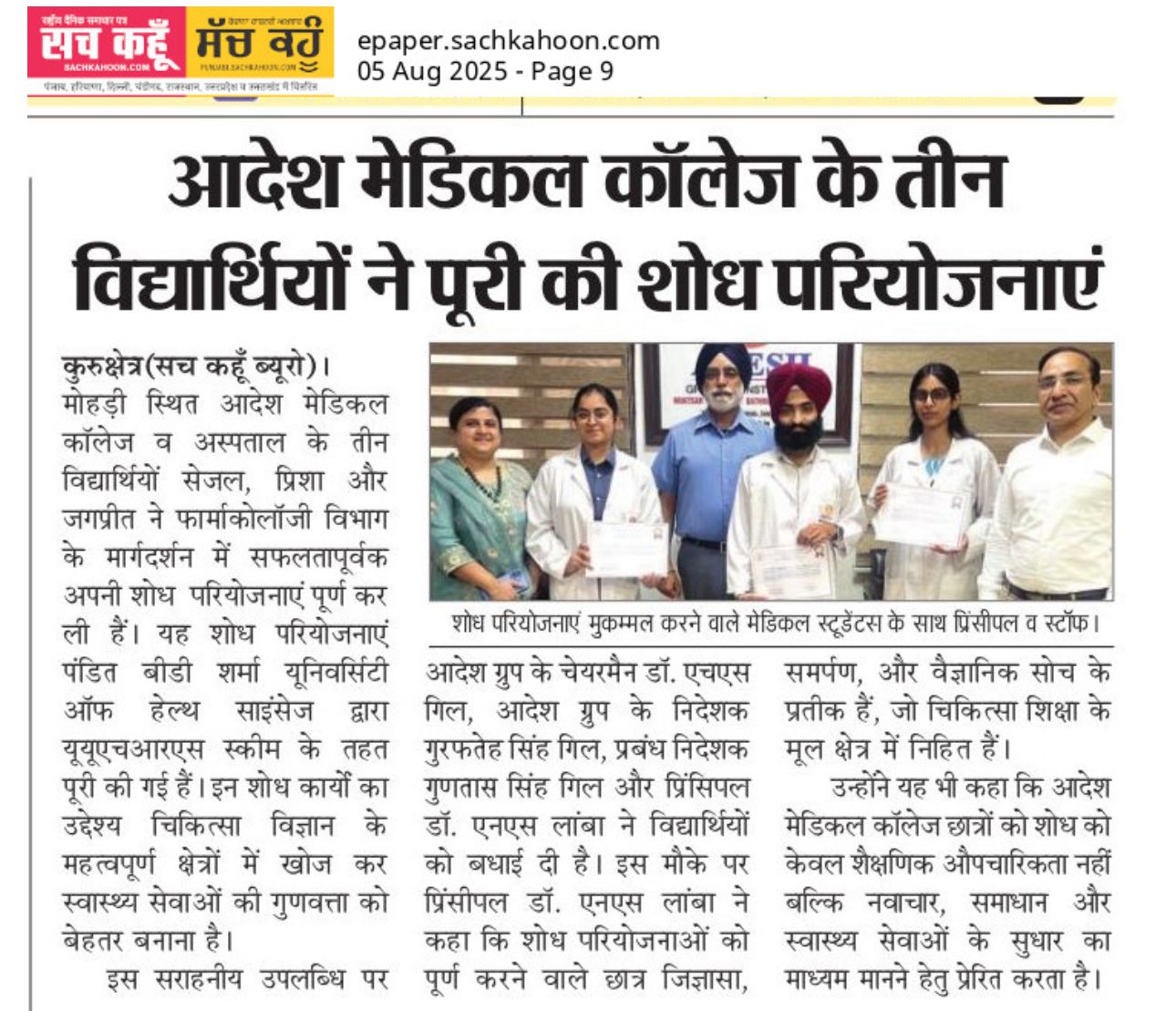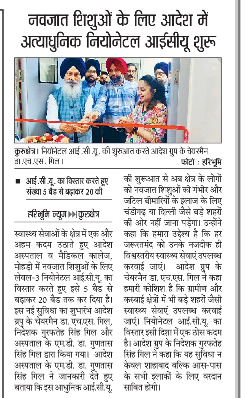 Latest News : Adesh Hospital Mohri Learn More त्वचा रोगियों को बड़ी राहत, आदेश के चर्म रोग विभाग में डायोड लेजर मशीन स्थापित Learn More आदेश में हृदय रोगी में लगाया गया दुनिया का सबसे छोटा माइकरा पेसमेकर Learn More आदेश में मरीजों की सुविधा और सुरक्षा को सर्वोच्च प्राथमिकता दी जाती है : डा. गुणतास गिल Learn More आदेश की ओर से लाडवा सीएचसी में होगी ' एडवांस गायनेकोलॉजी व ऑथोपेंडिक्स ओपीडी Learn More White coat ceremony organised at Adesh Medical College and Hospital Learn More Aadesh Medical College Takes A Major Leap Toward Green Energy, Inaugurates 1132 KW Solar Power Plant Learn More 17 किलो का ट्यूमर निकालकर आदेश अस्पताल ने बचाई किशोरी की जान Learn More रोटरी क्लब द्वारा आयोजित नेत्र रोग जांच शिविर में 404 रोगियों की हुई जांच Learn More Prakash Parv of Shri Guru Nanak Dev Ji celebrated in Adesh Medical College and Hospital, Mohri Learn More Illuminating Lives, Healing Hearts — This Diwali at Adesh Hospital Learn More Opening more doors for aspiring medical professionalsUnder the visionary leadership of Dr. H.S. Gill, Chairman (Adesh Group)we are thrilled to announce increase in MBBS Seats from Learn More आदेश में की गई अत्याधुनिक वर्टिगो लैब की स्थापना Learn More Vertigo Lab Inaugurated at Adesh Medical College & Hospital Learn More Adesh Heart Centre Marks Two Years of Transformative Cardiac Care, Saving Thousands of Lives Learn More आदेश मेडिकल कॉलेज की उपलब्धि :एमबीबीएस सीटें 150 से बढ़कर हुई 200 Learn More आदेश में महिलाओं के लिए परिवार नियोजन के लिए आधुनिक आसान प्रक्रिया शुरू Learn More आदेश मेडिकल कॉलेज के पी.जी. डॉक्टर्स ने रोहतक में रचा इतिहास Learn More Celebrating excellence in healthcare. Learn More आदेश अस्पताल के द्वारा लगाए हेल्थ कैंप में बच्चों के स्वास्थ्य की जांच : डा. फकीर चंद Learn More Learn More
