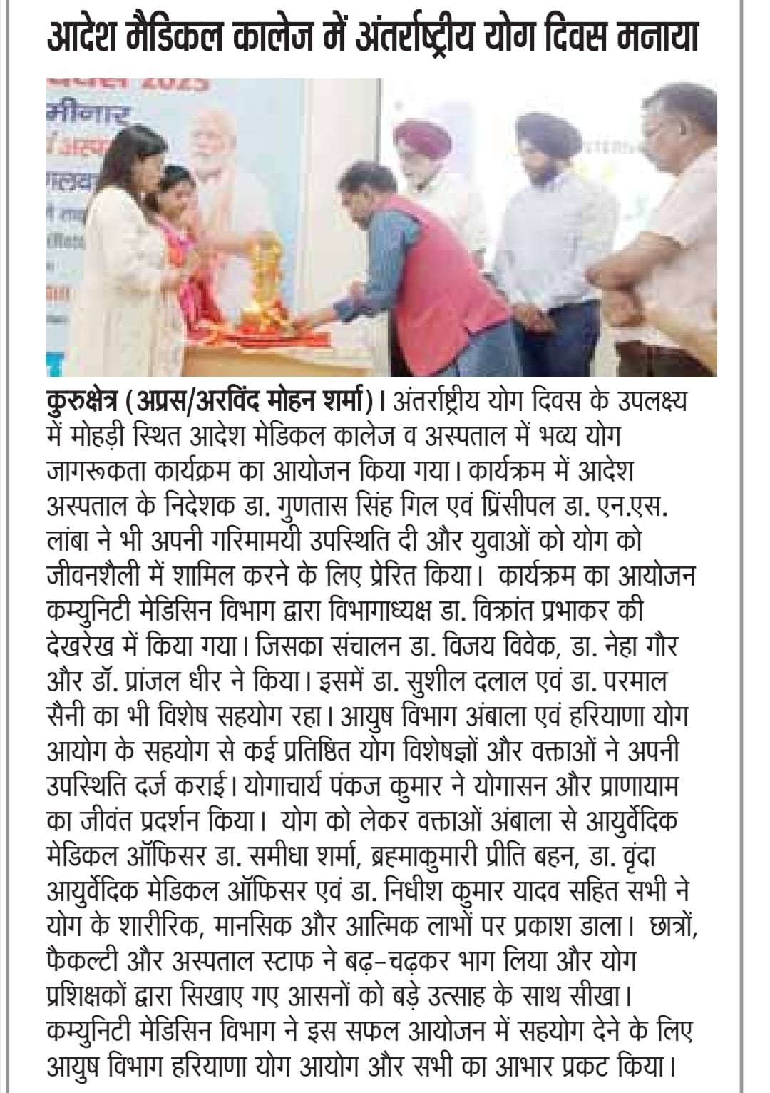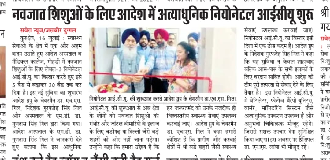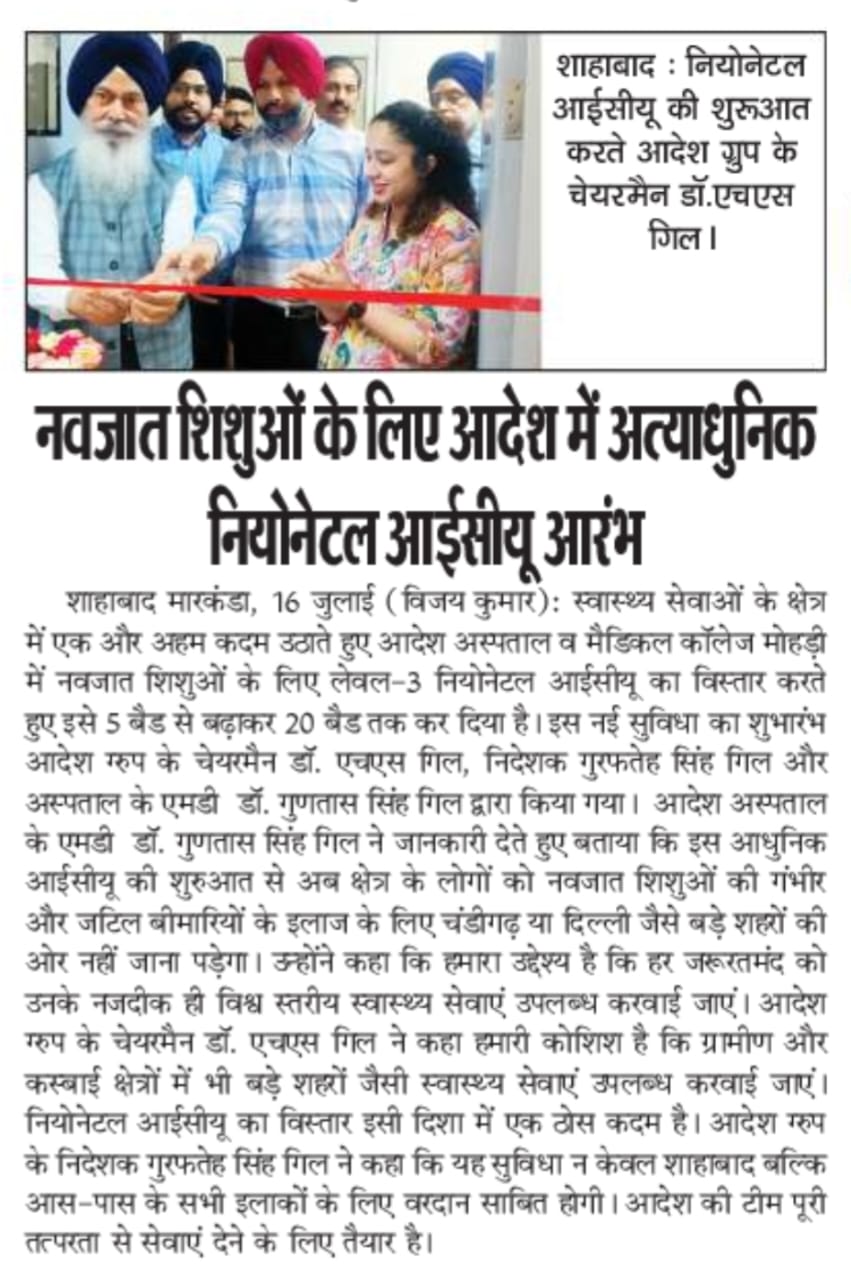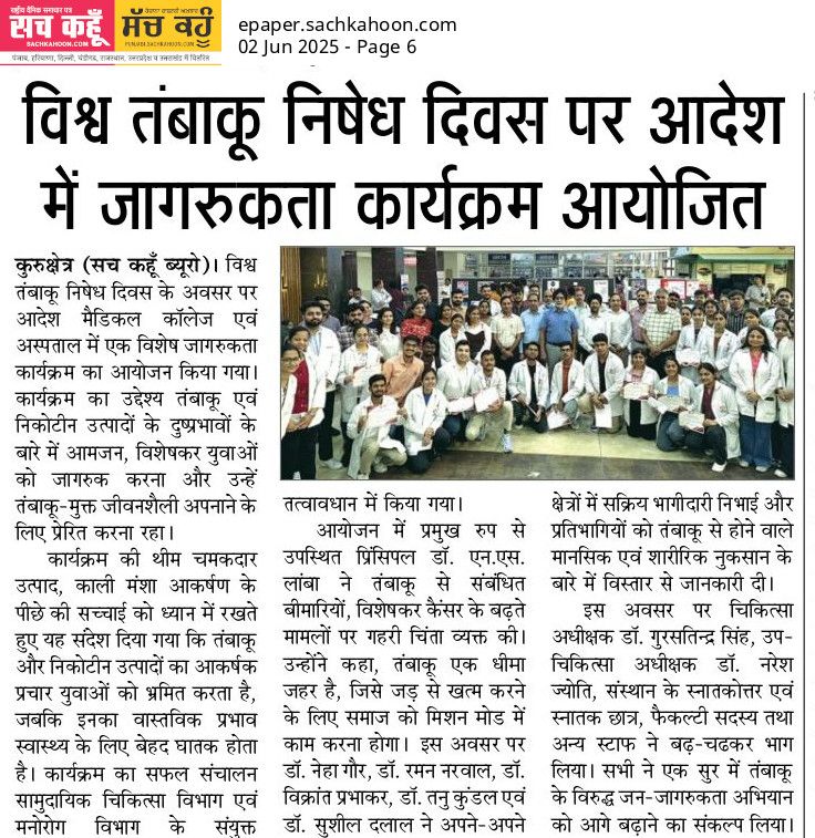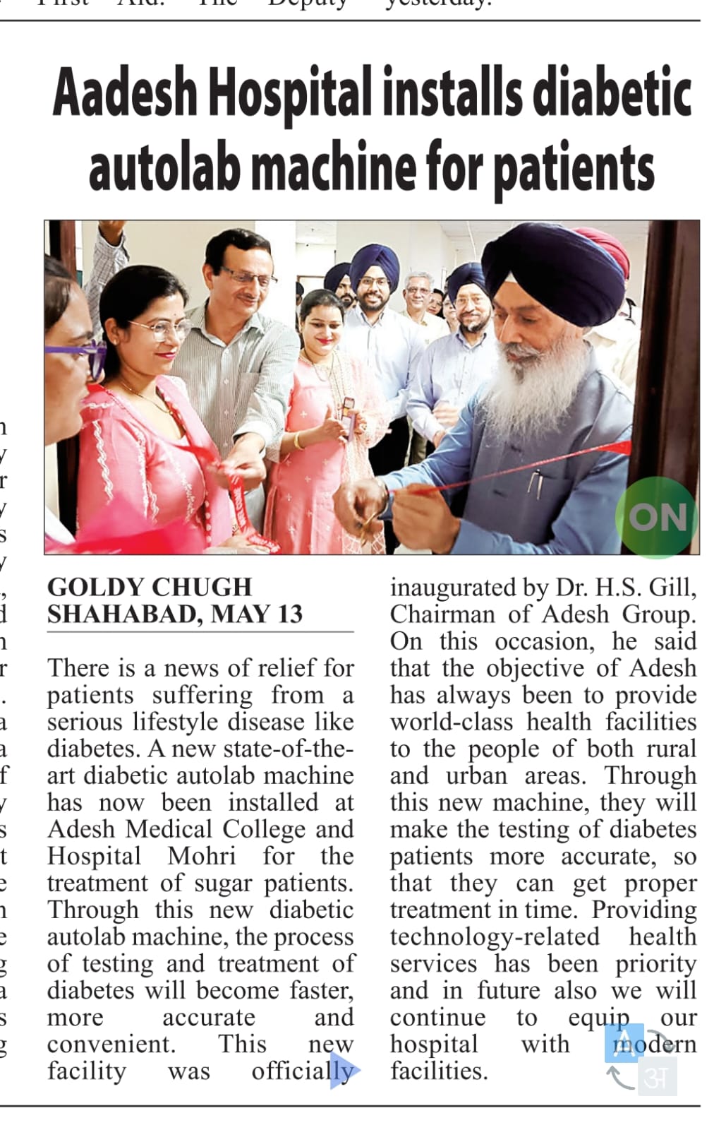 Latest News : Adesh Hospital Mohri Learn More त्वचा रोगियों को बड़ी राहत, आदेश के चर्म रोग विभाग में डायोड लेजर मशीन स्थापित Learn More आदेश में हृदय रोगी में लगाया गया दुनिया का सबसे छोटा माइकरा पेसमेकर Learn More आदेश में मरीजों की सुविधा और सुरक्षा को सर्वोच्च प्राथमिकता दी जाती है : डा. गुणतास गिल Learn More आदेश की ओर से लाडवा सीएचसी में होगी ' एडवांस गायनेकोलॉजी व ऑथोपेंडिक्स ओपीडी Learn More White coat ceremony organised at Adesh Medical College and Hospital Learn More Aadesh Medical College Takes A Major Leap Toward Green Energy, Inaugurates 1132 KW Solar Power Plant Learn More 17 किलो का ट्यूमर निकालकर आदेश अस्पताल ने बचाई किशोरी की जान Learn More रोटरी क्लब द्वारा आयोजित नेत्र रोग जांच शिविर में 404 रोगियों की हुई जांच Learn More Prakash Parv of Shri Guru Nanak Dev Ji celebrated in Adesh Medical College and Hospital, Mohri Learn More Illuminating Lives, Healing Hearts — This Diwali at Adesh Hospital Learn More Opening more doors for aspiring medical professionalsUnder the visionary leadership of Dr. H.S. Gill, Chairman (Adesh Group)we are thrilled to announce increase in MBBS Seats from Learn More आदेश में की गई अत्याधुनिक वर्टिगो लैब की स्थापना Learn More Vertigo Lab Inaugurated at Adesh Medical College & Hospital Learn More Adesh Heart Centre Marks Two Years of Transformative Cardiac Care, Saving Thousands of Lives Learn More आदेश मेडिकल कॉलेज की उपलब्धि :एमबीबीएस सीटें 150 से बढ़कर हुई 200 Learn More आदेश में महिलाओं के लिए परिवार नियोजन के लिए आधुनिक आसान प्रक्रिया शुरू Learn More आदेश मेडिकल कॉलेज के पी.जी. डॉक्टर्स ने रोहतक में रचा इतिहास Learn More Celebrating excellence in healthcare. Learn More आदेश अस्पताल के द्वारा लगाए हेल्थ कैंप में बच्चों के स्वास्थ्य की जांच : डा. फकीर चंद Learn More Learn More
